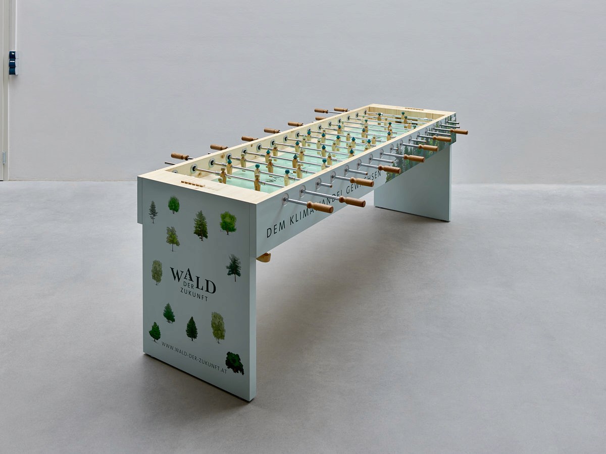 Bringt Design und Spielfreude nach draußen. Wetterfeste Materialien wie Aluminium, Glas und Eichenholz bilden die Basis, Griffe, Prallwände und Lagergehäuse in moderner 3D Druck Technik setzen einen innovativen Akzent. So entsteht ein Tischfußballtisch, der auch im Freien stilvoll und langlebig bleibt.